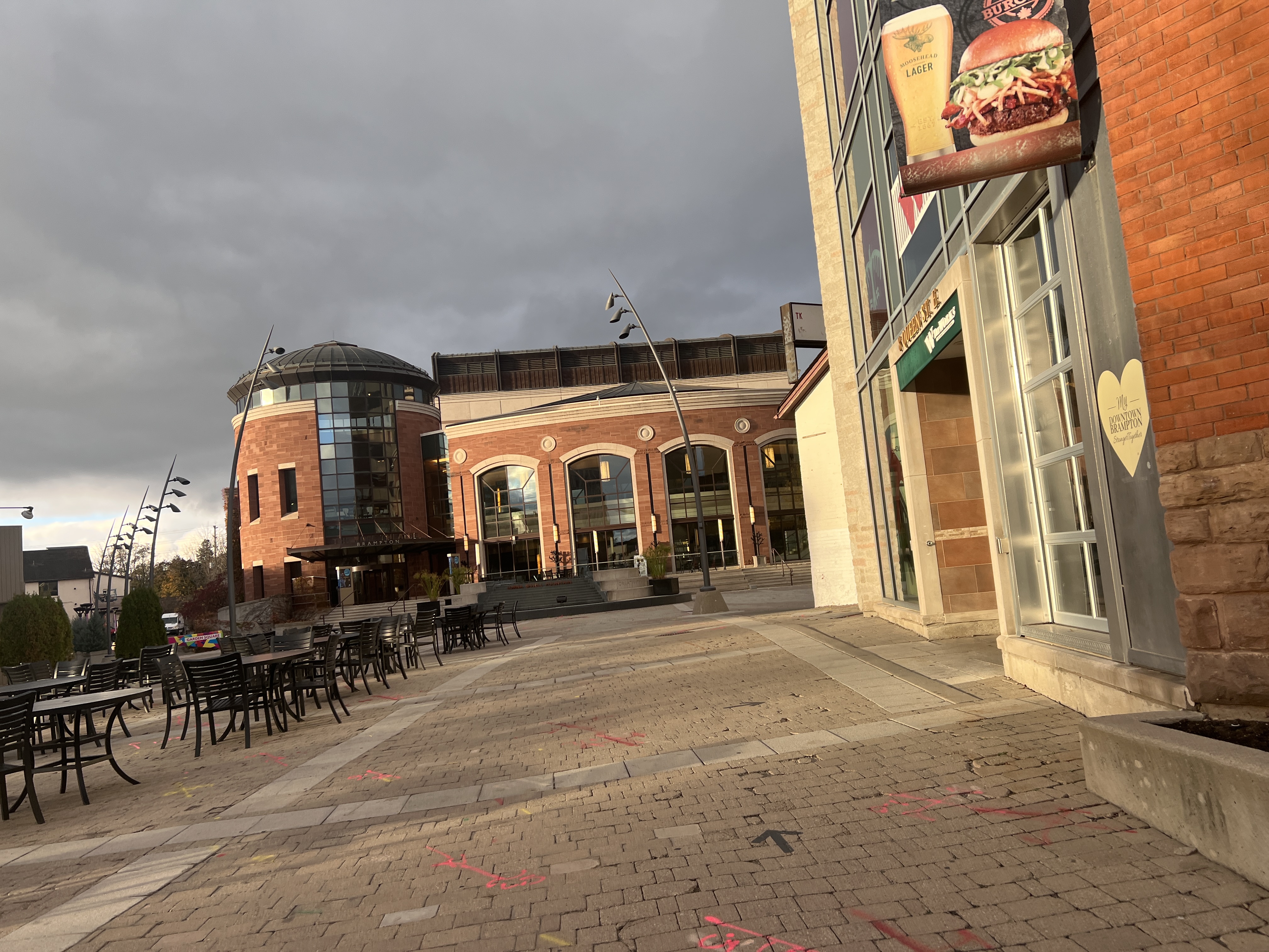 The Garden Square in the Main street of Brampton is an entertainment and commuter site. There is a large screen accompanied with proportionally big speakers designed for large groups of people to watch a concert— such events as The Tragically Hip’s concert playing there in 2016.